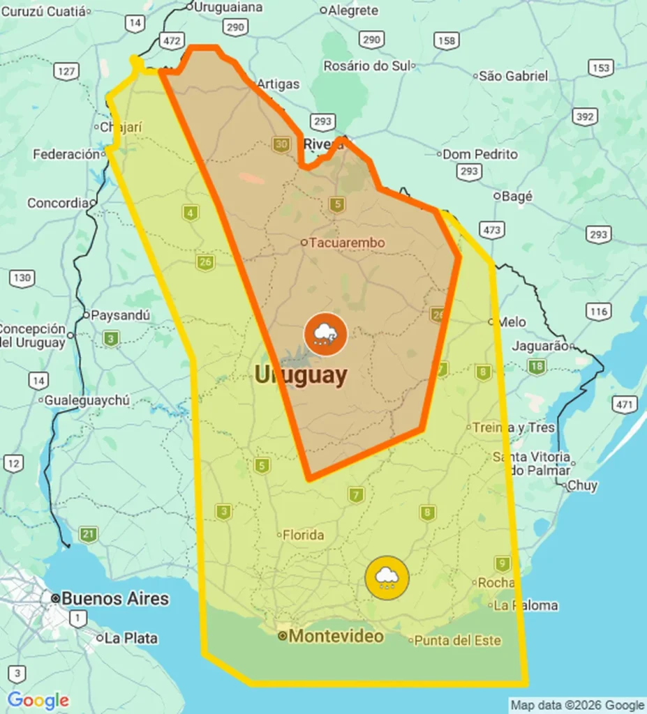 El Instituto Uruguayo de Meteorología (Inumet) emitió una advertencia naranja que afecta a Rivera y otras zonas del norte del país, por tormentas fuertes y lluvias intensas.