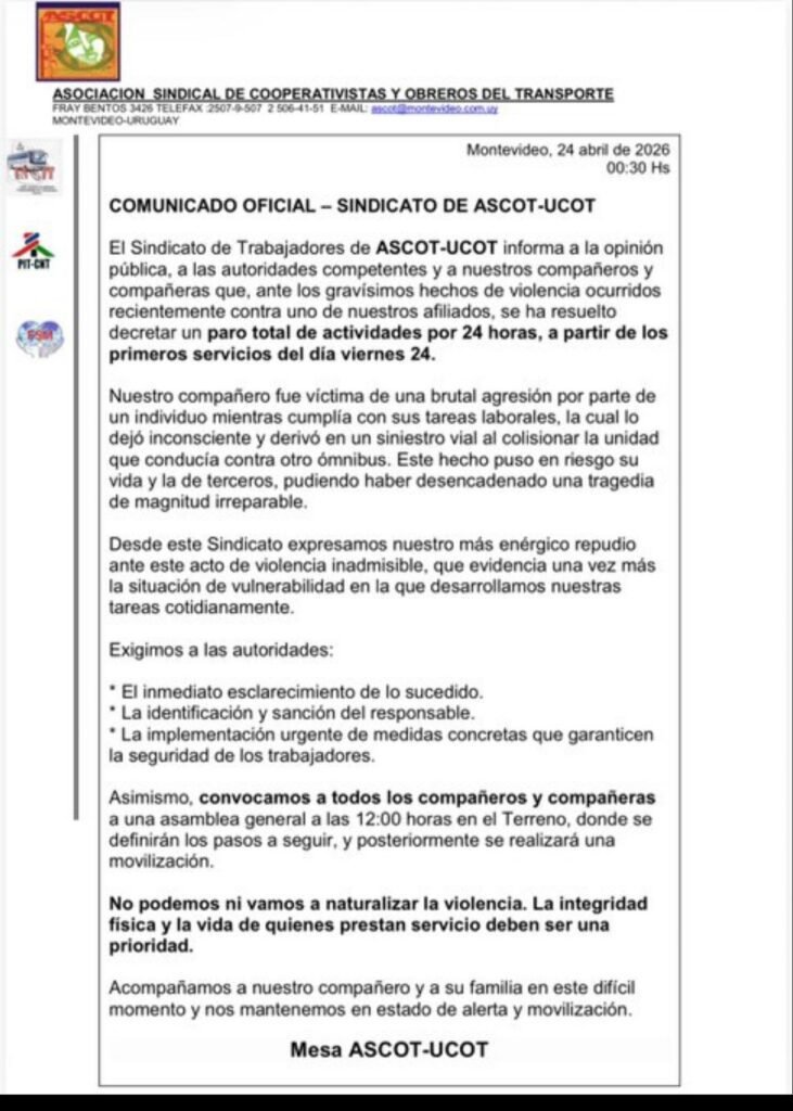 Un chofer de UCOT fue brutalmente agredido por el conductor de otro vehículo mientras circulaba por Bulevar Artigas, en un episodio que terminó con el trabajador inconsciente y el ómnibus chocando contra otra unidad, según informó Teledoce.