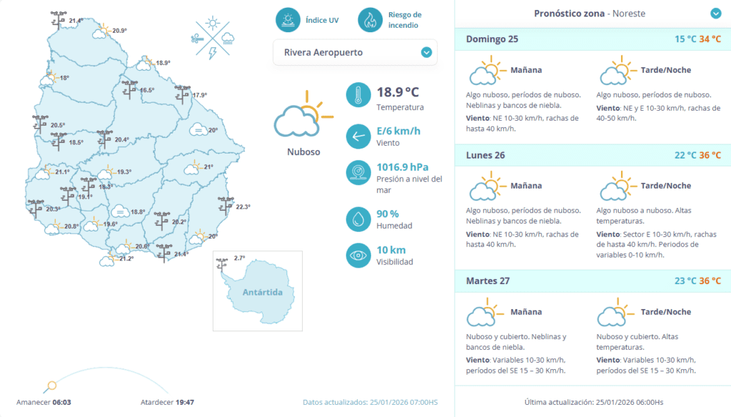 Actualización: 25/01/2026 (mañana). Rivera atraviesa días de altas temperaturas, con períodos de nubosidad y neblinas/bancos de niebla principalmente en la mañana. También se esperan vientos del NE/E con rachas moderadas.
